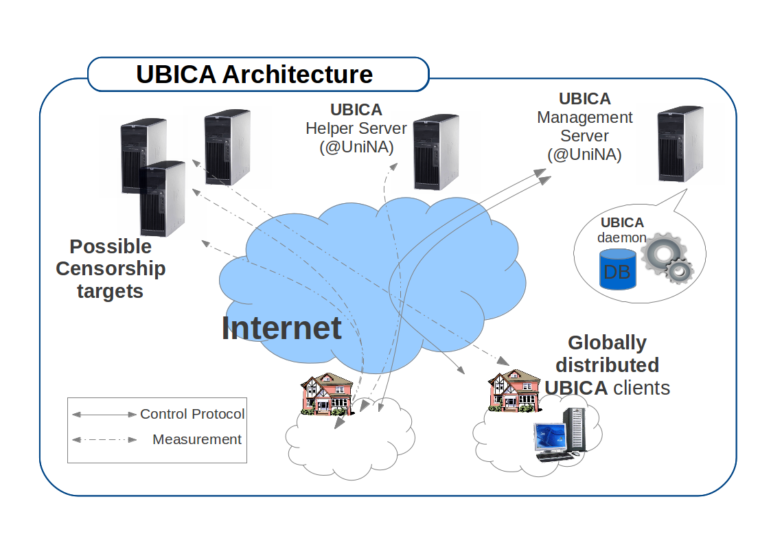 UBICA (User-based Internet Censorship Analysis) is a research project of University of Napoli "Federico II", led by prof. Antonio Pescapè and partially funded by a Google Faculty Research Award in 2013. The research project aims at advancing the state of the art in the field of Internet censorship analysis implementing a multi-platform and open-source client (UBICA censorship monitor) to be distributed worldwide in order to perform a number of censorship tests, mainly traffic manipulations and content blocking. The UBICA censorship monitor will leverage a measurement and management infrastructure currently employed by the proposing research team for broadband network performance evaluation on national scale (HoBBIT) to provide easy deployment and update of new censorship tests, keep a low computational footprint on the hosts, and perform integrated analysis of the experimental results. By means of the UBICA censorship monitor we aim at collecting and analyzing (avoiding any concerns about user privacy) heterogeneous and independent data sources related to censors activity. The research project aims to: (i) improve the current state of the art in the field of censorship analysis; (ii) relate Quality of Service parameters, geographical location, and access technologies with the results of censorship tests; (iii) infer possible side-effects that censorship techniques enforced by a government in a country can have on a global scale; (iv) make available both the monitor source code and a set of anonymized collected data related to evidences of censorship. Architecture Thanks to a modular client design, new tests are deployed on user permission without reinstalling or even stopping the client, lowering the barrier to the deployment of new detection experiments. All tests perform active measurements, i.e. no information from user activity or user traffic is collected, avoiding possible concerns about user privacy, as the tests use automatically generated traffic to infer possible censorship. Some tests (namely, traffic manipulation ones) employ server-based helper applications: a server counterpart is deployed on the management infrastructure. In general, the destinations of probe traffic are of three types: (i) Internet services (DNS, open web proxies, TOR relays); (ii) web servers hosting content potentially subject to censorship; (iii) helper measurement servers. For the tests that check content blocking, the list of potential targets is generated on the management server, using several sources of information, such as the Herdict project, TOR relay lists, open proxy lists, worldwide popular social networking and news lists. The orchestration of the tests, the client update, the distribution of the targets lists as well as the collection and analysis of the results will be done by means of a management infrastructure, based on the HoBBIT project.